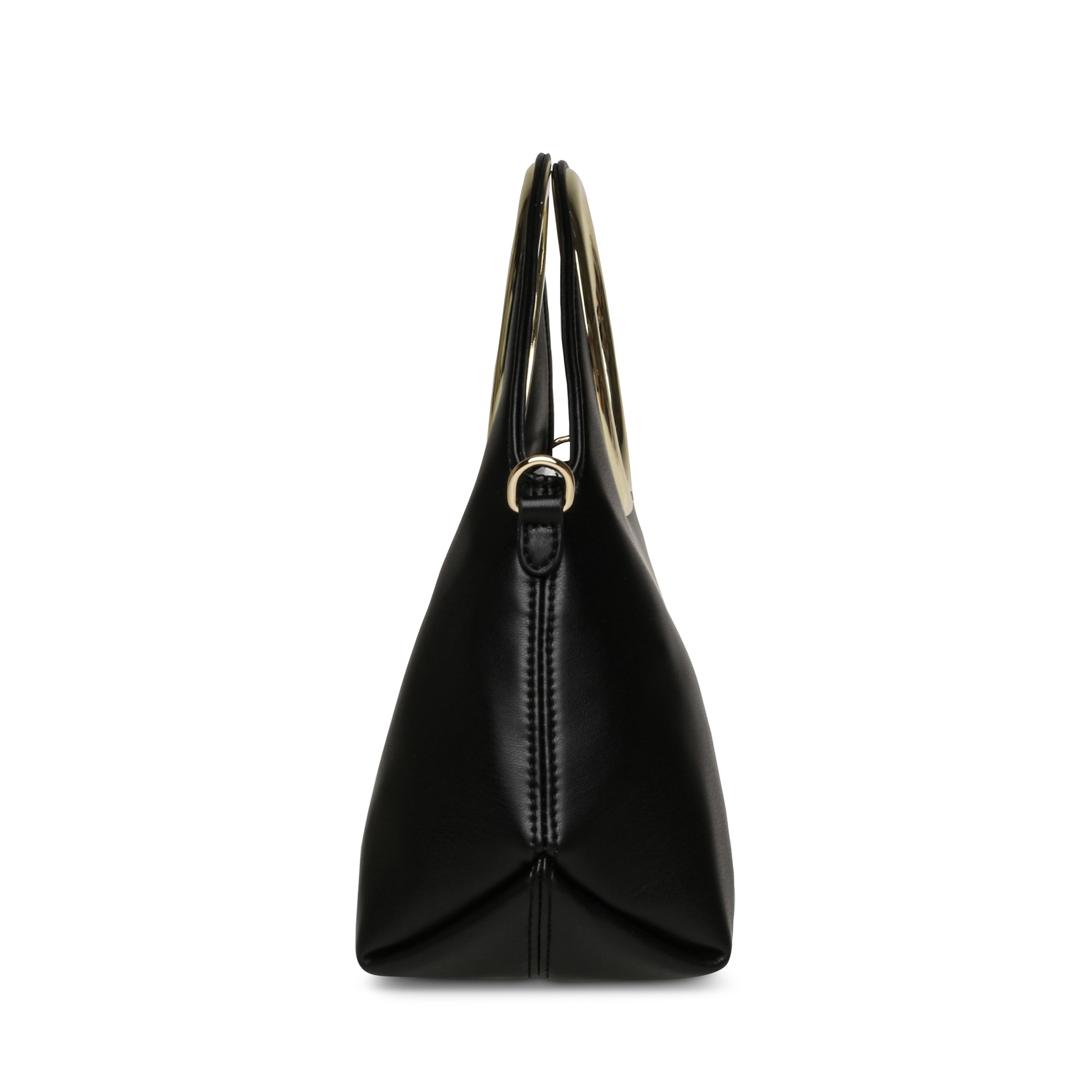 大胆なフープハンドルがこのバッグの顔となり、一見ミニマルながらも確かな存在感を主張します。